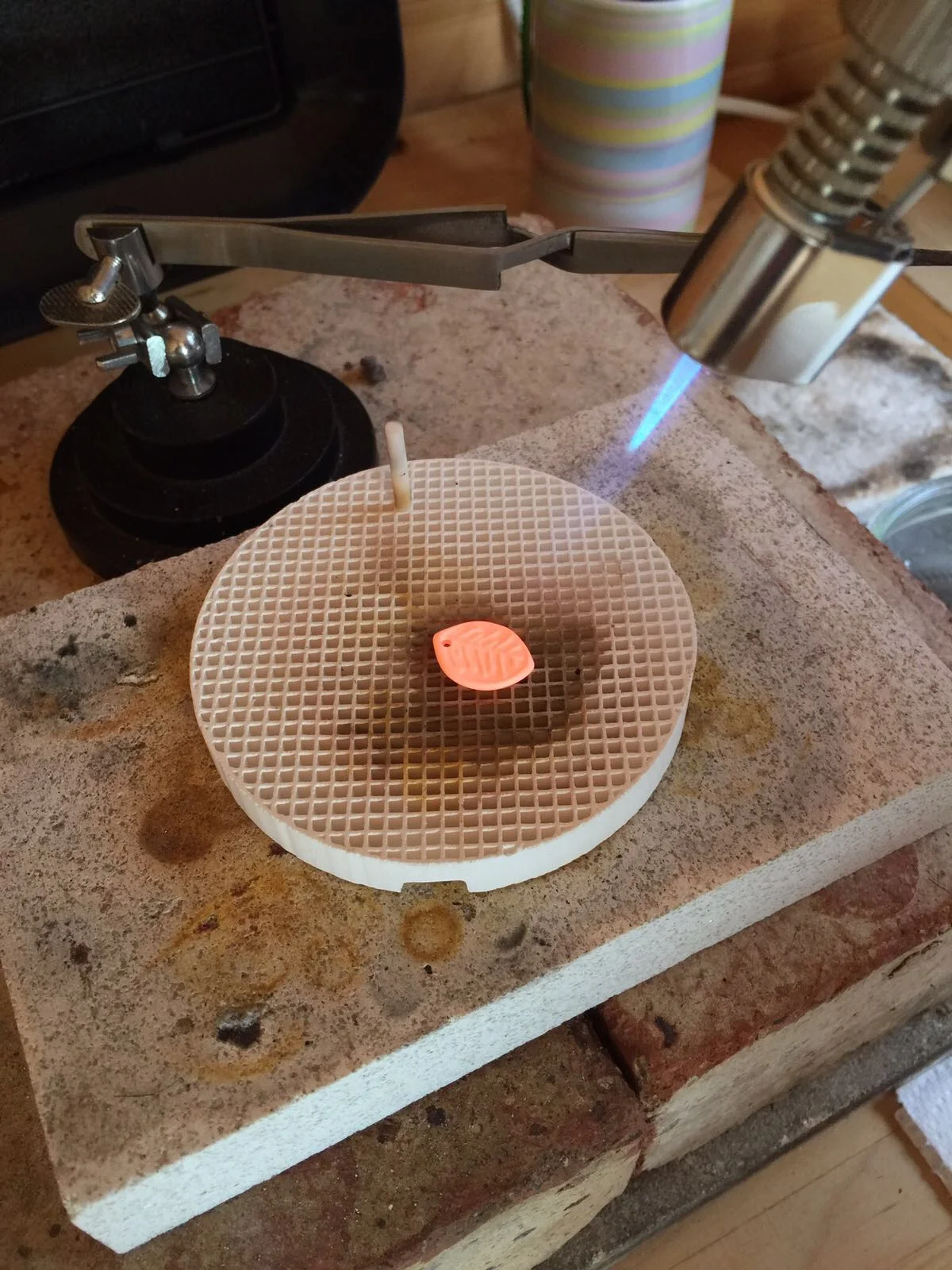 Firing the precious metal clay. Care needs to be taken with timings and temperatures.