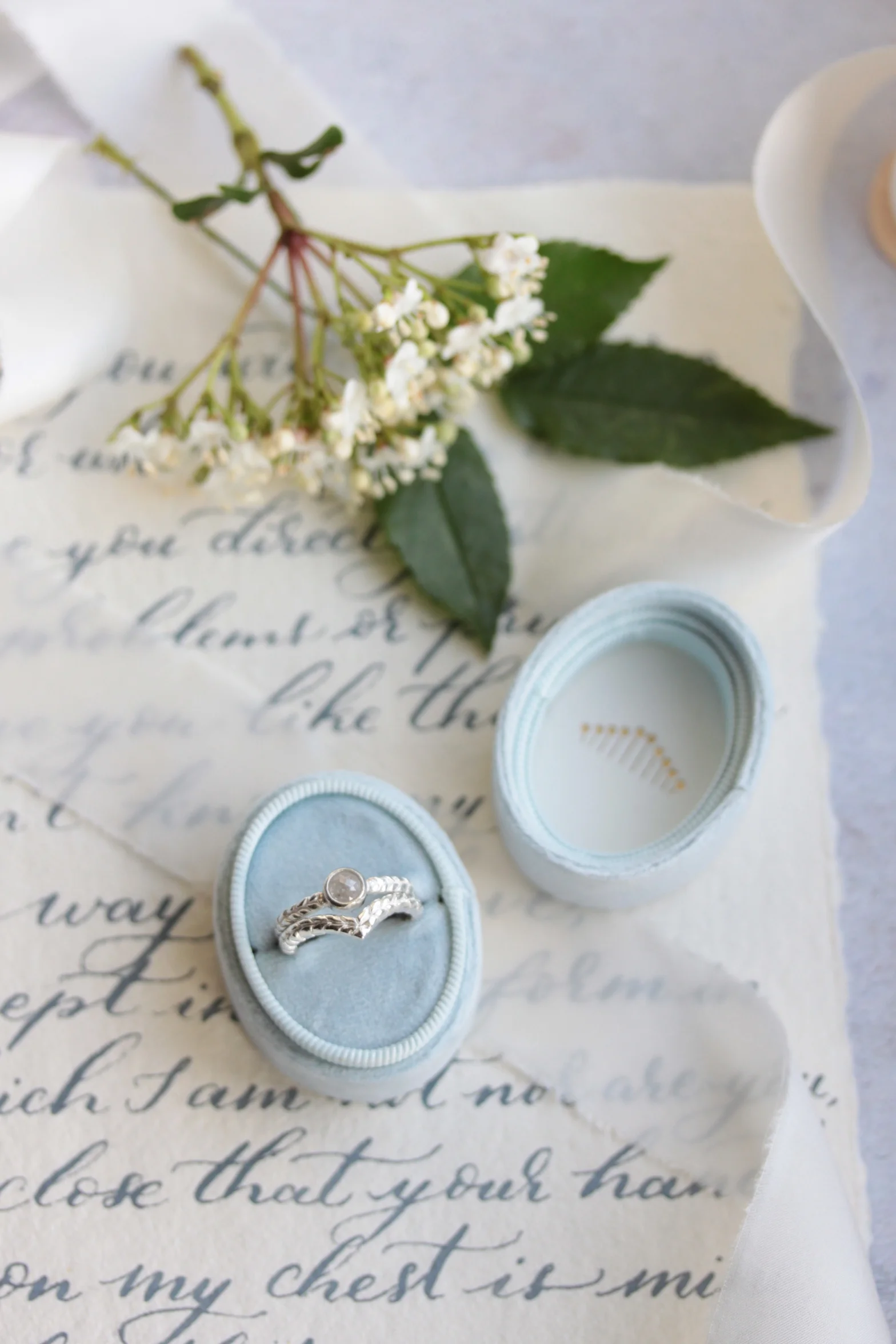 After casting, the rings needed some further refining, with a setting soldered on for the gemstone. An ethereal opaque diamond was chosen for the stone, to suit the bride’s cool and muted colour preference. Here are the finished rings, I hope you like them!