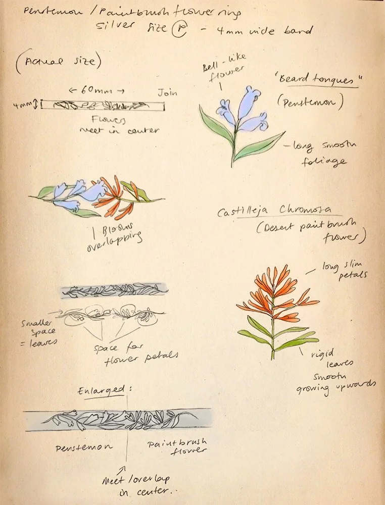 To start the commission I looked at some reference images of the flowers (as well as the penstemons in my garden) and played around with a layout and composition. I imagined the flowers growing towards each other and meeting in the middle of the ring band. I came up with an idea based on my reference sketches: