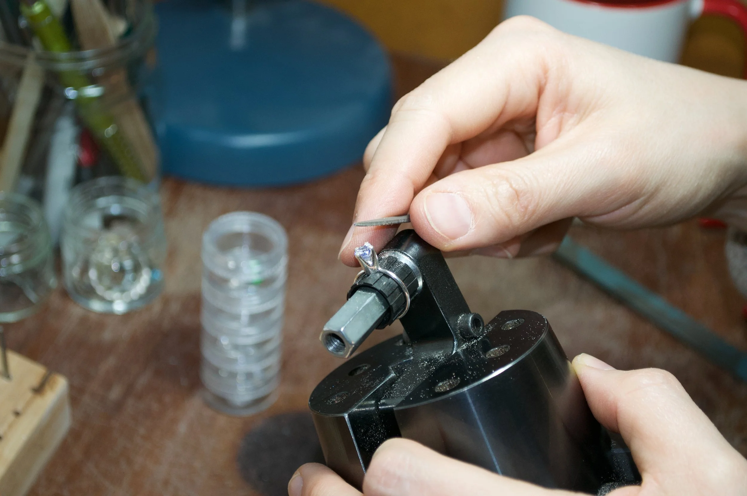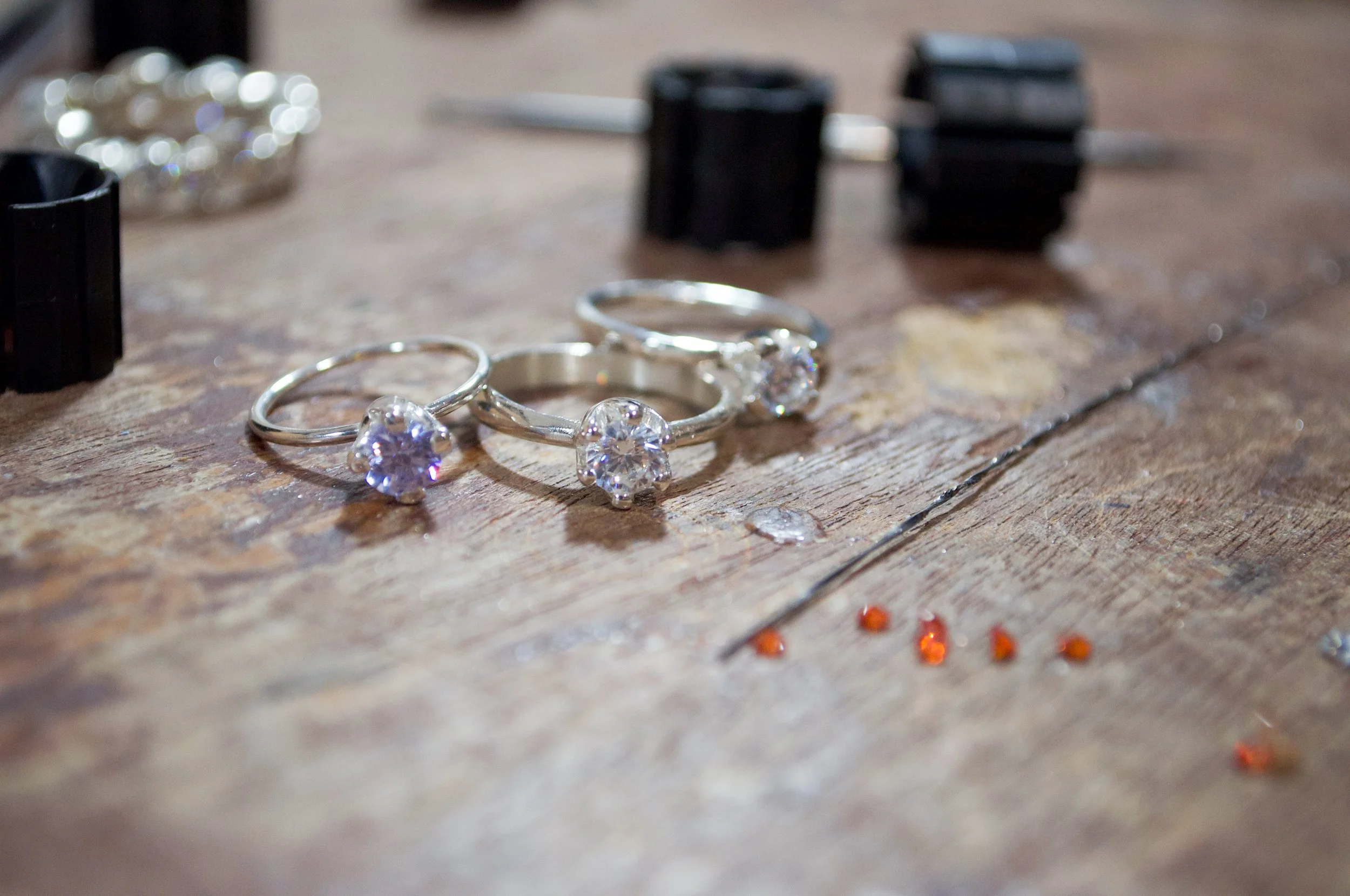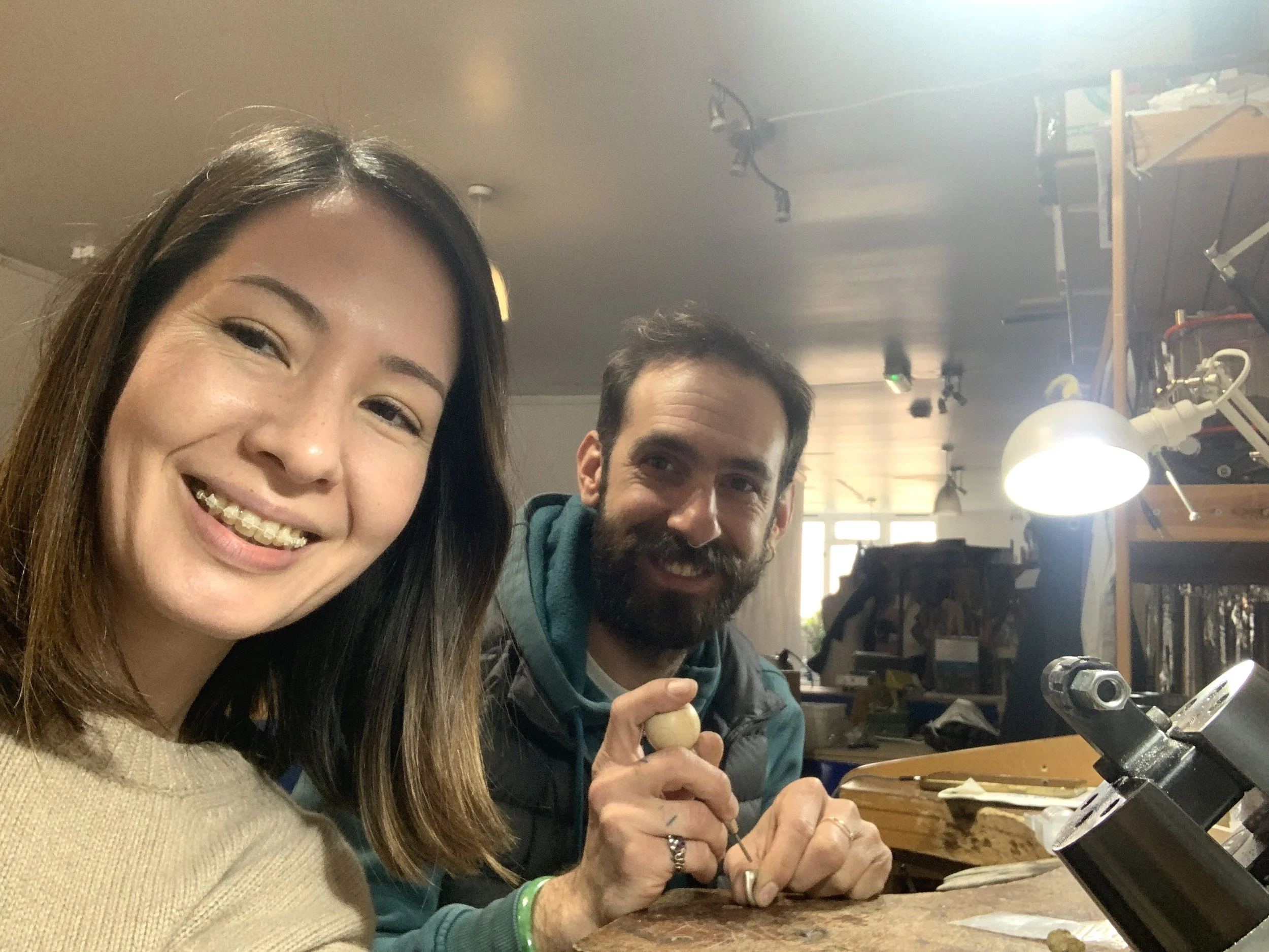 Once the waxes were cast in silver and I was ready to set the stones. Stelios showed me some helpful methods for setting, and how to use tools like a hammer action setting punch, which I’d never used before. Setting isn’t easy but I had a few pieces to practice with, and the techniques Stelios showed me made it a lot simpler.