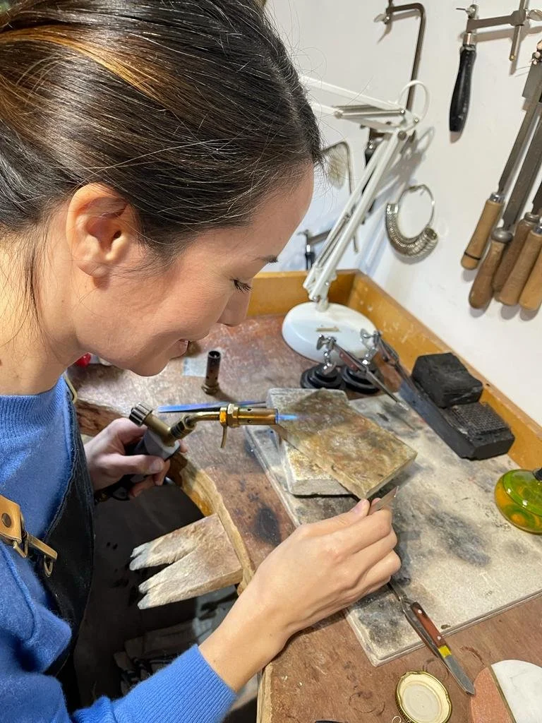 Stelios’ studio is based just off Brick Lane in East London. It’s a lovely creative space and really well equipped. We started out with some soldering, as I don’t have a brazing torch in my own workshop. It was great to use his Sievert torch and Little Smith torch (which I am now coveting!) I prepared some earrings with lots of fiddly joins; this maximised my learning experience. I enjoy the challenge of soldering, there are so many variables to ensure a successful and strong solder join. Also factors like being able to adjust levels gas and oxygen for different jobs like annealing, which isn’t something I’d been able to fully experience with my own torch. Taking part in this learning helped me decide which torch would be best investing in the future. Stelios showed me a lot of techniques and methods which were really helpful.