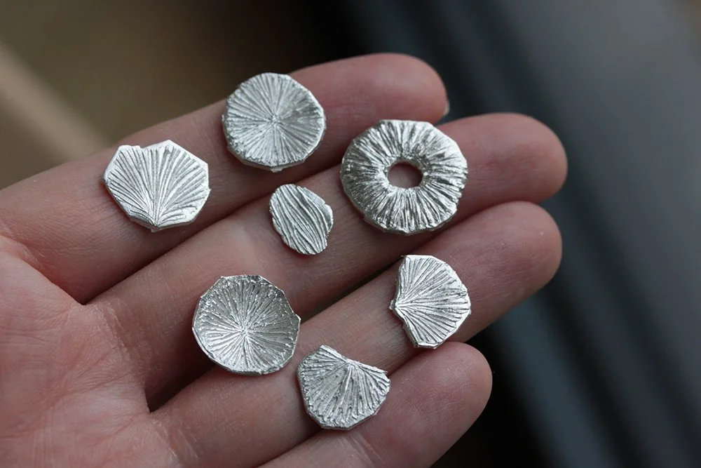 Lately I’ve been experimenting with ways to create fungi-inspired textures in a jewellery piece. I have more of an art approach to making, rather than a jeweller approach. I’ve been carving into wax but started out with print-making to visualise textures. Then I tried imprinting textures onto different materials. I’ve made some samples in silver. I’m unsure where it’s going, I’m thinking to give them some form, and create clusters maybe. I find the creative process both exciting and a little frustrating, but trust it every time. I’ve always believed that creativity is a process, and not necessarily an outcome - either way this release of creative energy is a good thing. It feeds my brain and soul! Here are some of the things I’ve been making, if my ideas develop some more I will be sure to share them.