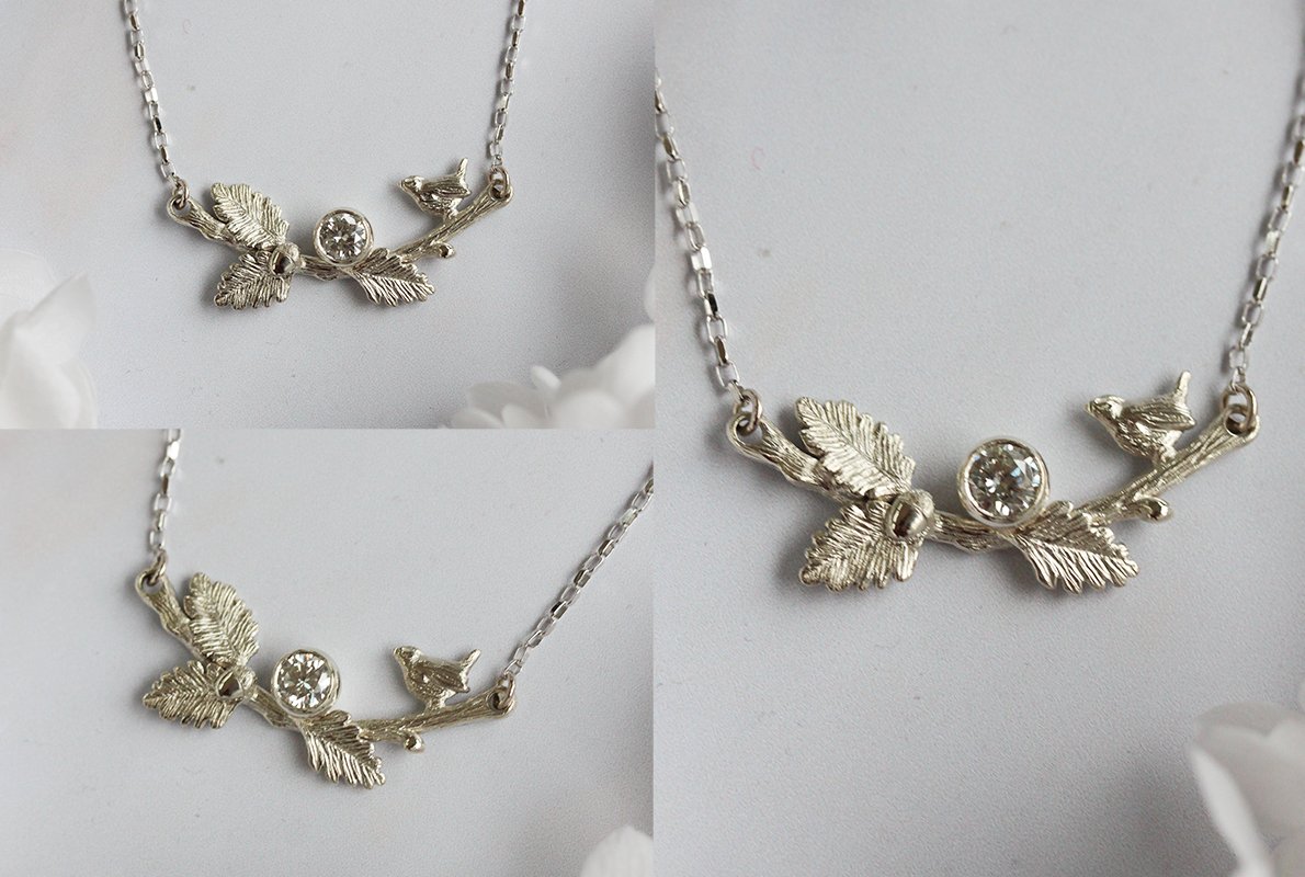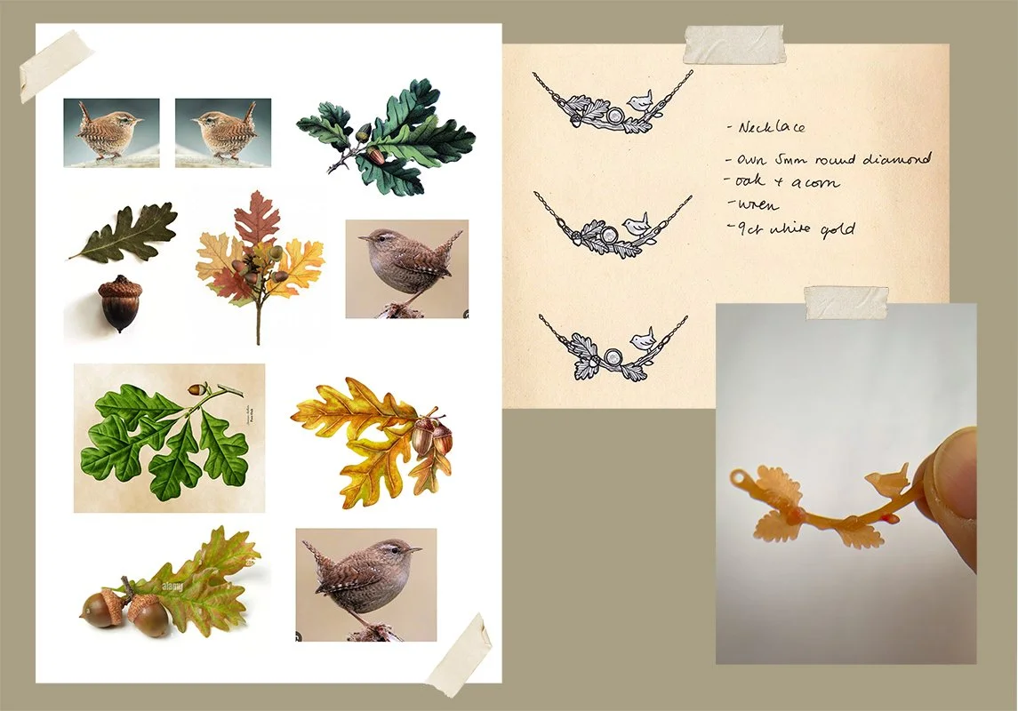 The golden oak trees on my walks have caught my eye lately, reminding me of one of my favourite commissions from earlier this year. I was entrusted with my client’s precious diamond, which was inherited from her Grandmother. The brief was to create a necklace featuring the diamond, alongside oak leaves, and acorn, and a little wren bird. All of my favourite things! It was such a creative piece to design, and I loved sketching the elements in different compositions.