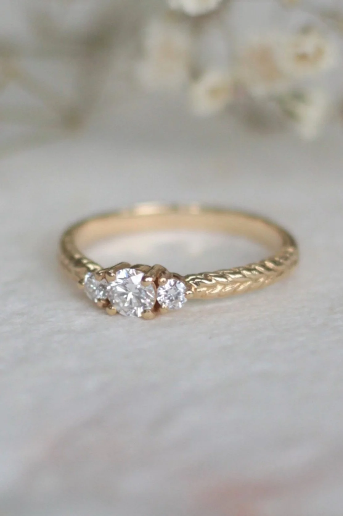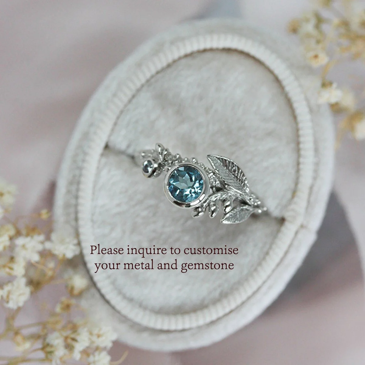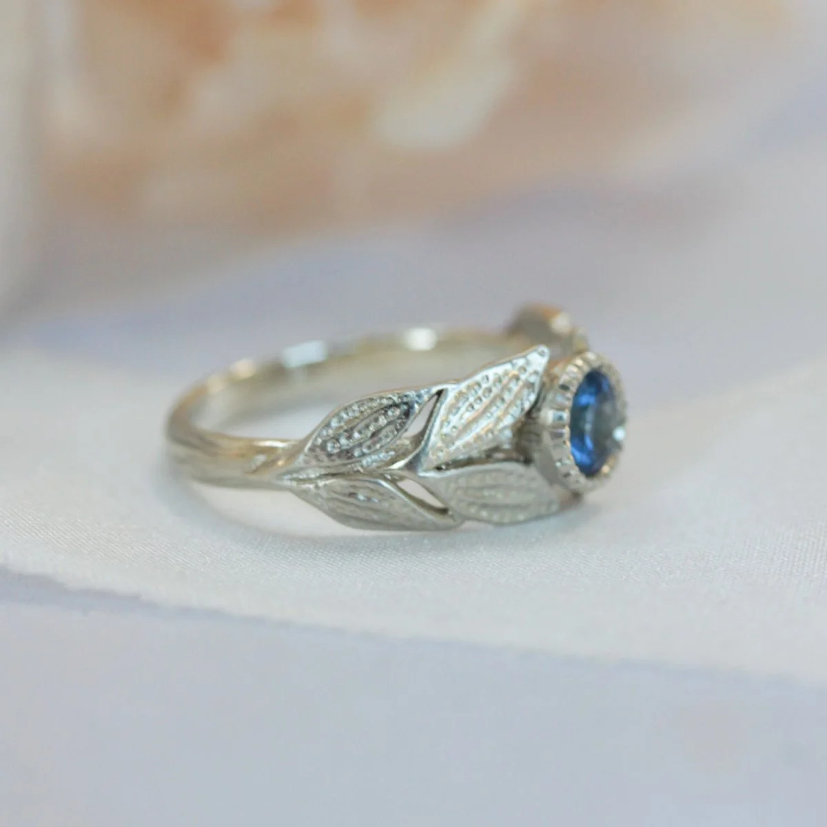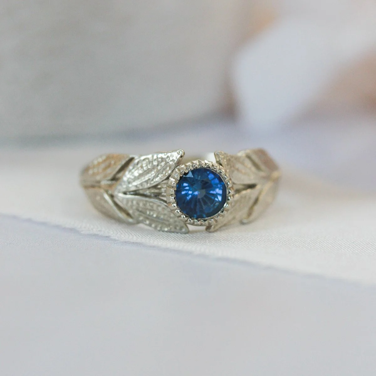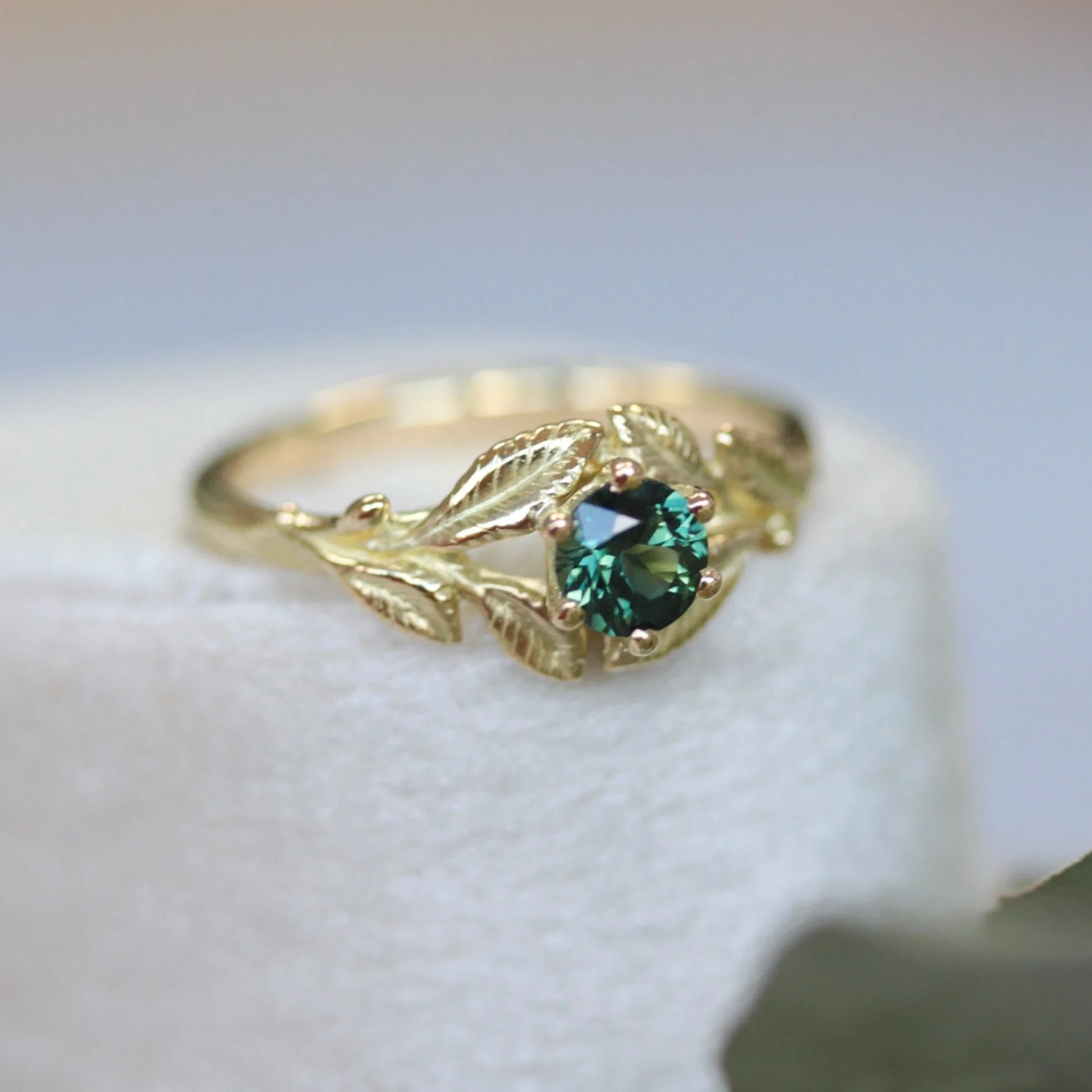 Leaf garland diamond engagement ring £1,825.00 Lily leaf blue sapphire engagement ring £1,745.00 Rowan leaf green sapphire gold engagement ring from £1,885.00 Rowan leaf white sapphire gold engagement ring from £1,775.00 Elder green tourmaline gold ring from £660.00 Meadow trilogy diamond gold engagement ring £1,530.00 Meadow sapphire and diamond white gold trilogy ring from £1,375.00 Spinel and sapphire gold lichen ring £1,585.00